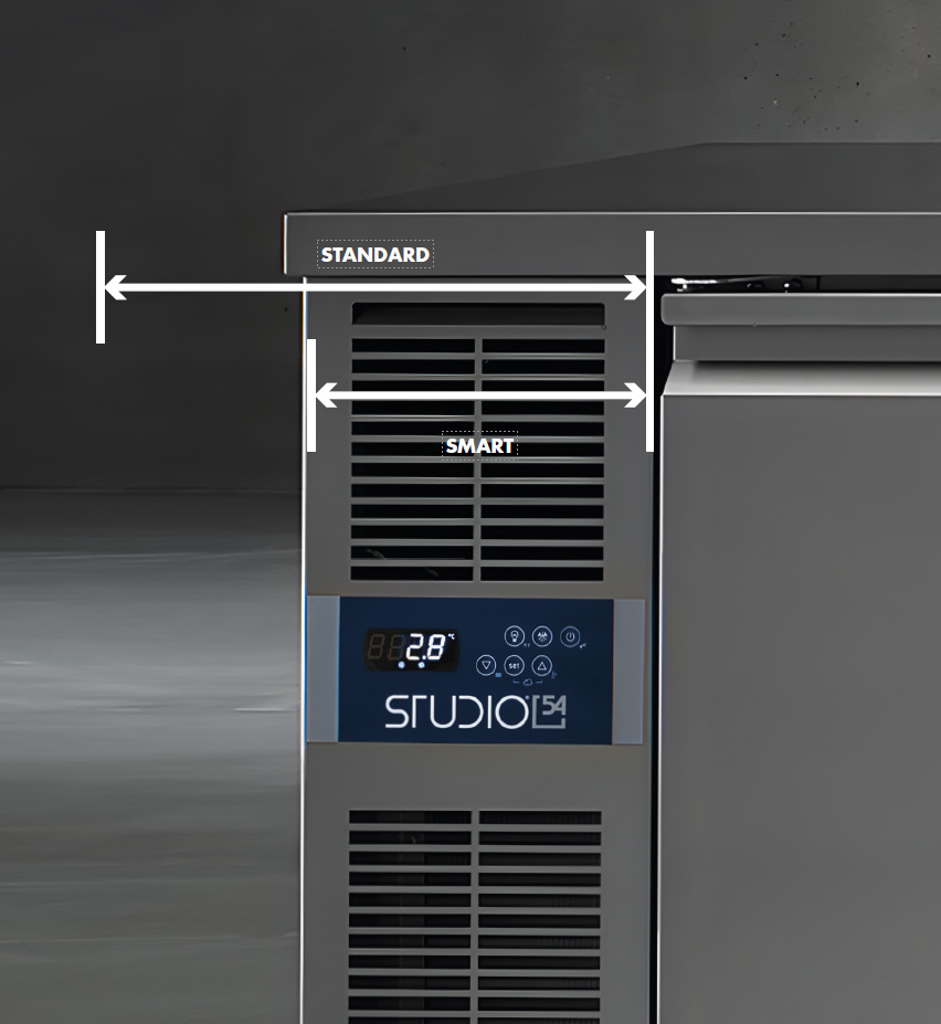 The engine compartment of the smart line is smaller and narrower, with a 220 mm width, yet it still delivers efficiency, quality and ecological responsibility on a par with a larger motor. The smart stainless steel refrigerated counter comes in different solutions and sizes.